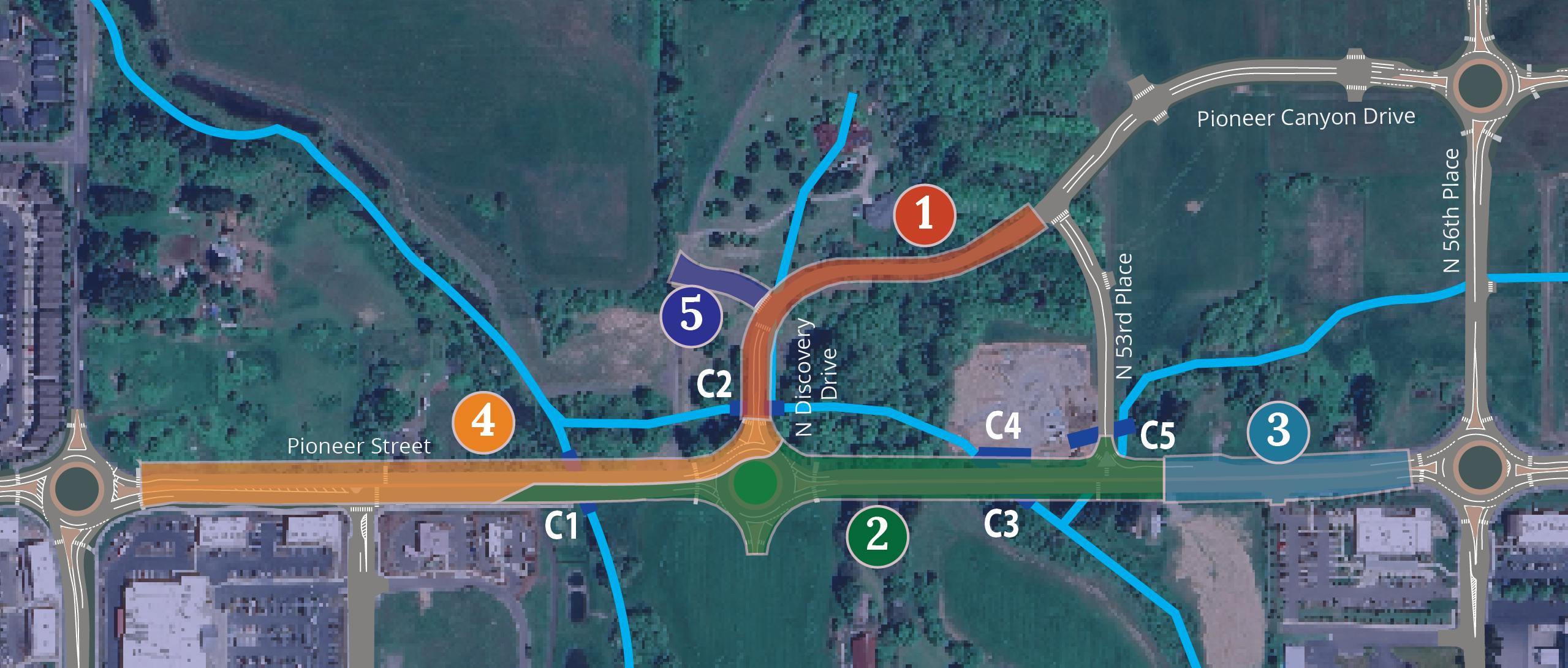 Section 2: N 53rd Place and Pioneer Street Intersection, Discovery Drive Roundabout, Widening west to Discovery Drive |