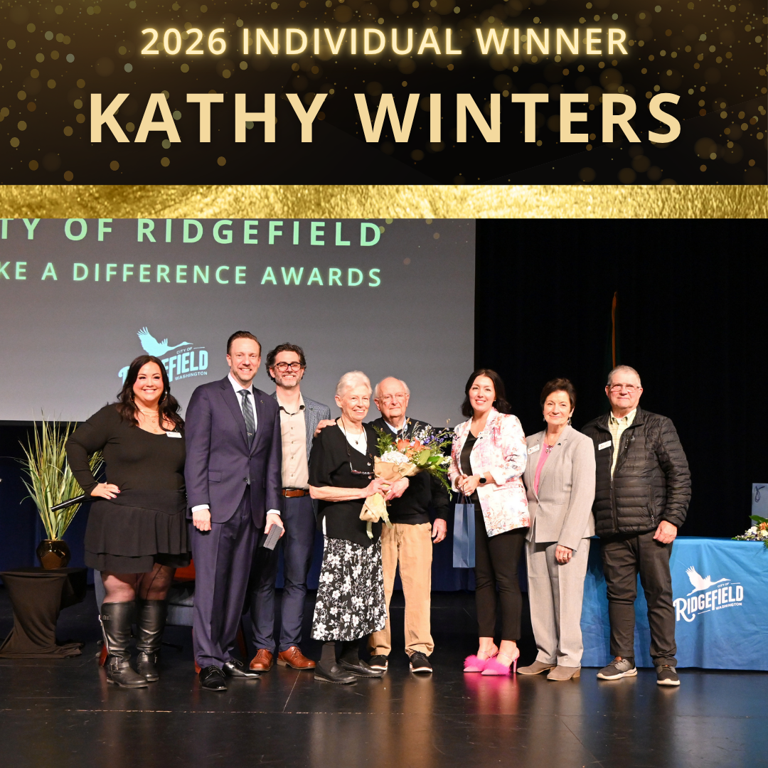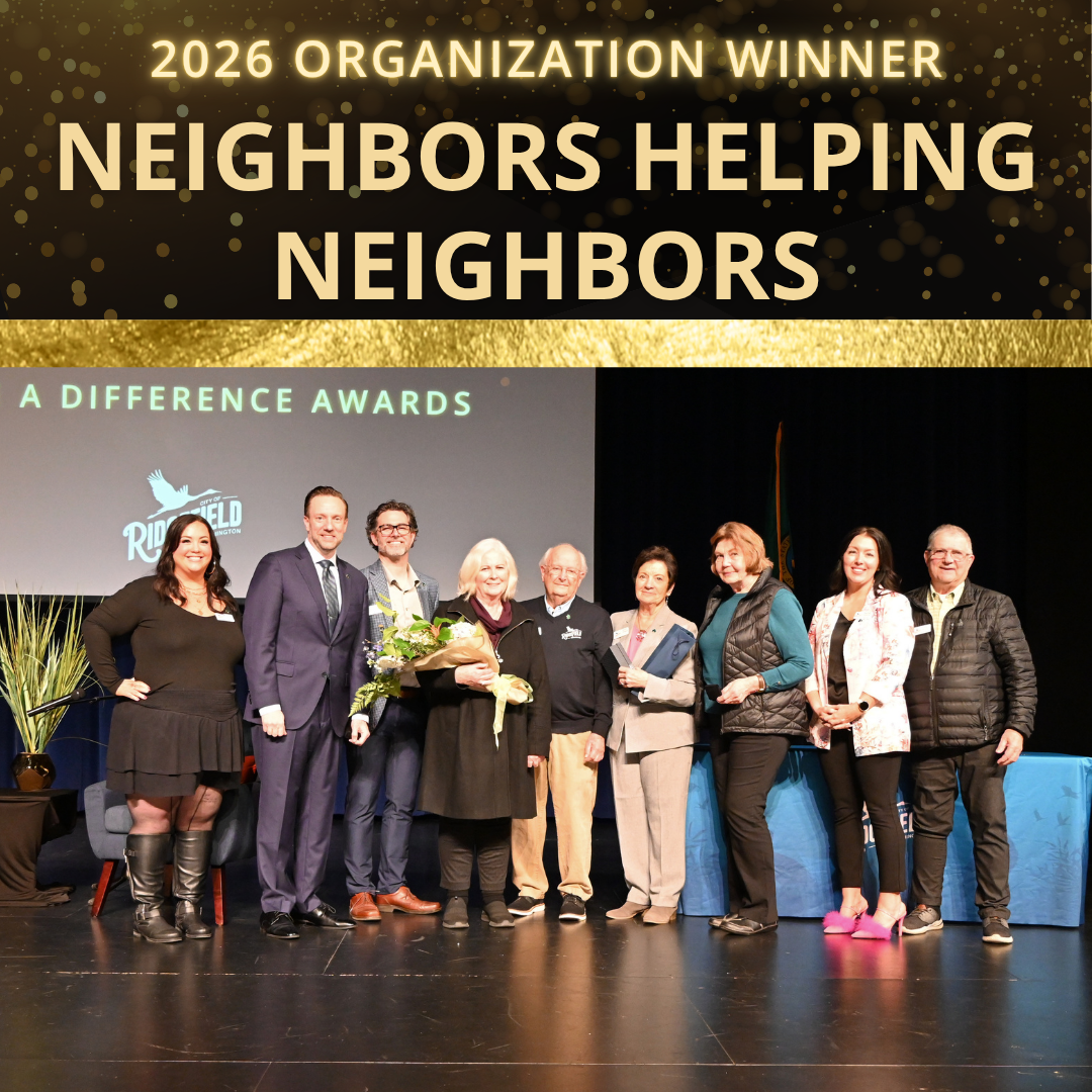| Kathy Winters was recognized as our Individual Award Winner for her participation in multiple non-profits, reading with children, painting and more. In 2025 she was instrumental in bringing the Ridgefield Art Gallery into reality. Her positive impact on community spaces is not new as her fundraising efforts to build the new Ridgefield Community Library were paramount. | Neighbors Helping Neighbors was recognized as this year's Organization Award Winner. They provide food and other essentials to hundreds of people monthly from the 98642 zip code, and manage the Giving Tree each holiday season to provide holiday gifts for families in need. |